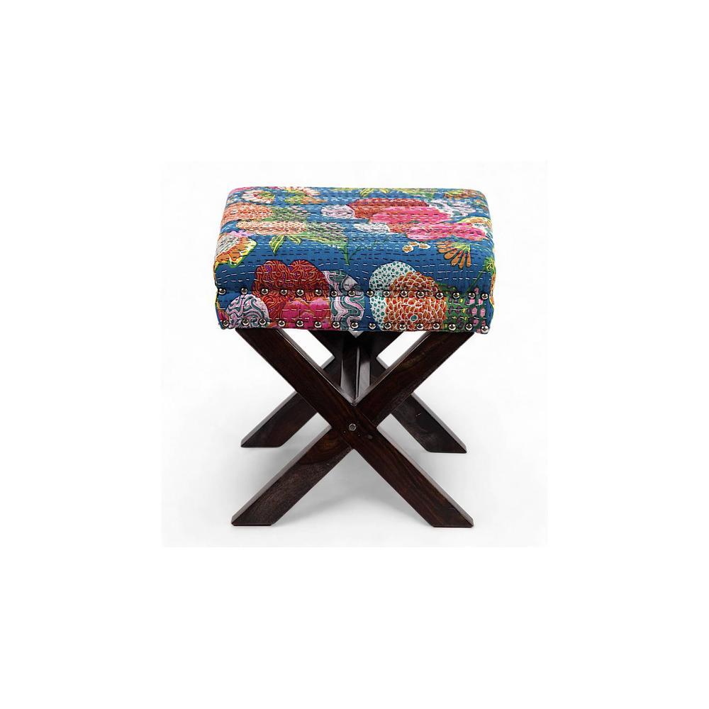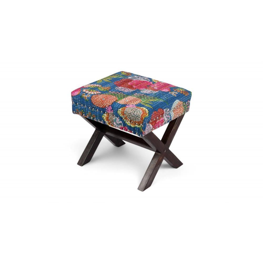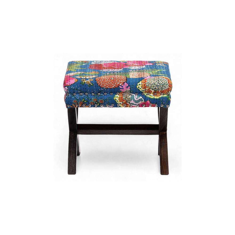 Solid Wood Pouf Stool in Fruit Print Blue Ethnic Kantha fabric